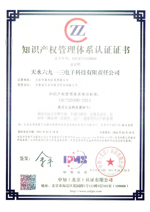 天水六九一三電子科技有限責任公司取得了由中知(北京)認證有限公司頒發(fā)的知識產(chǎn)權(quán)管理體系認證證書。